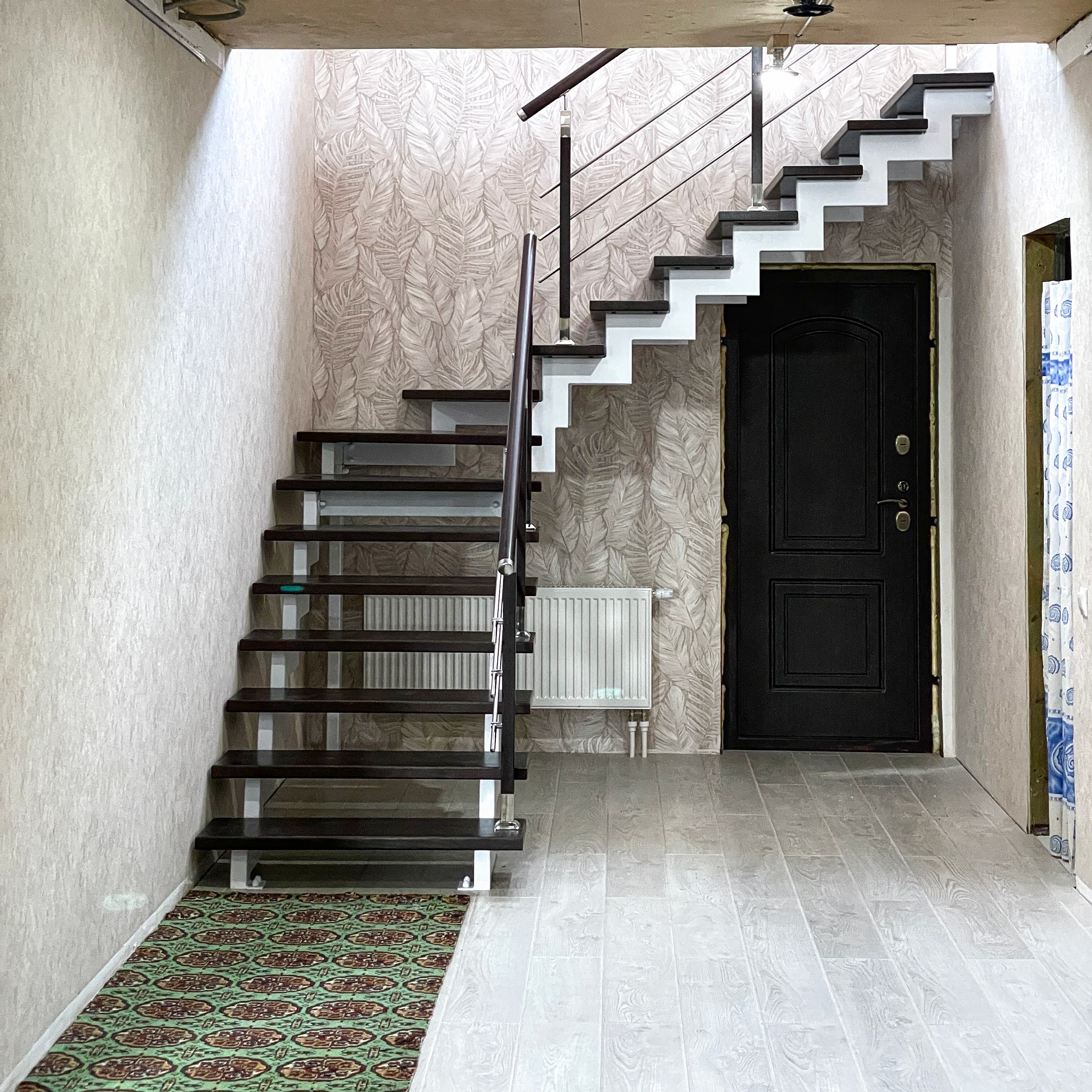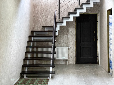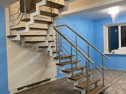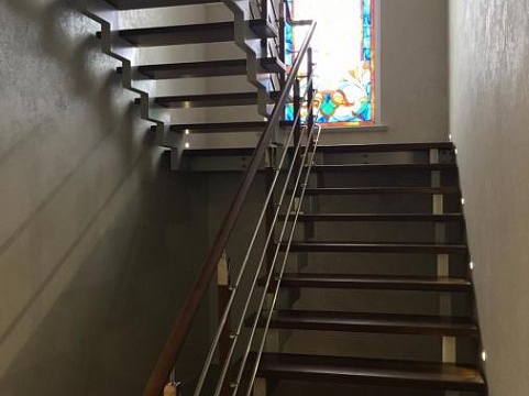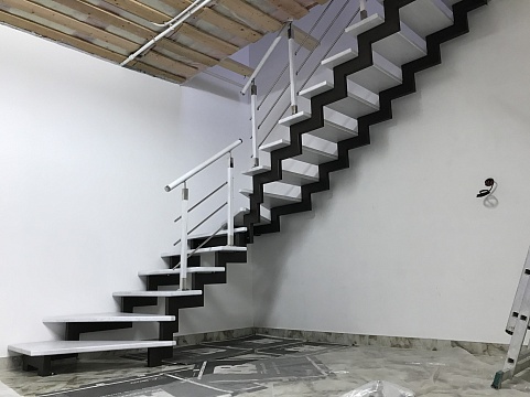 Ломаный косоур из профильной трубы. Такой каркас имеет неограниченный срок службы. Он прочный и надежный. Собирается без сварки. Ступени крепятся без болтов и саморезов, крепеж скрытый.